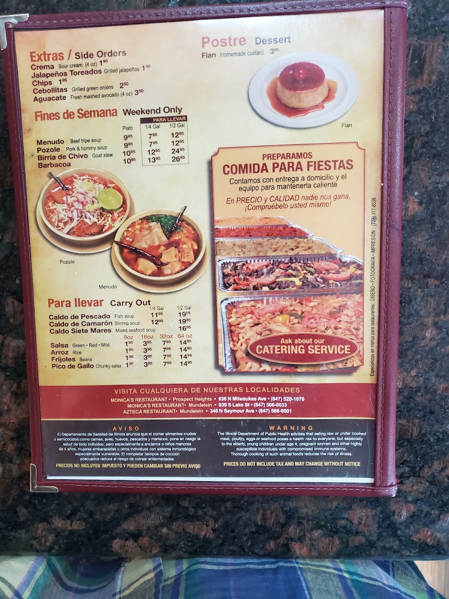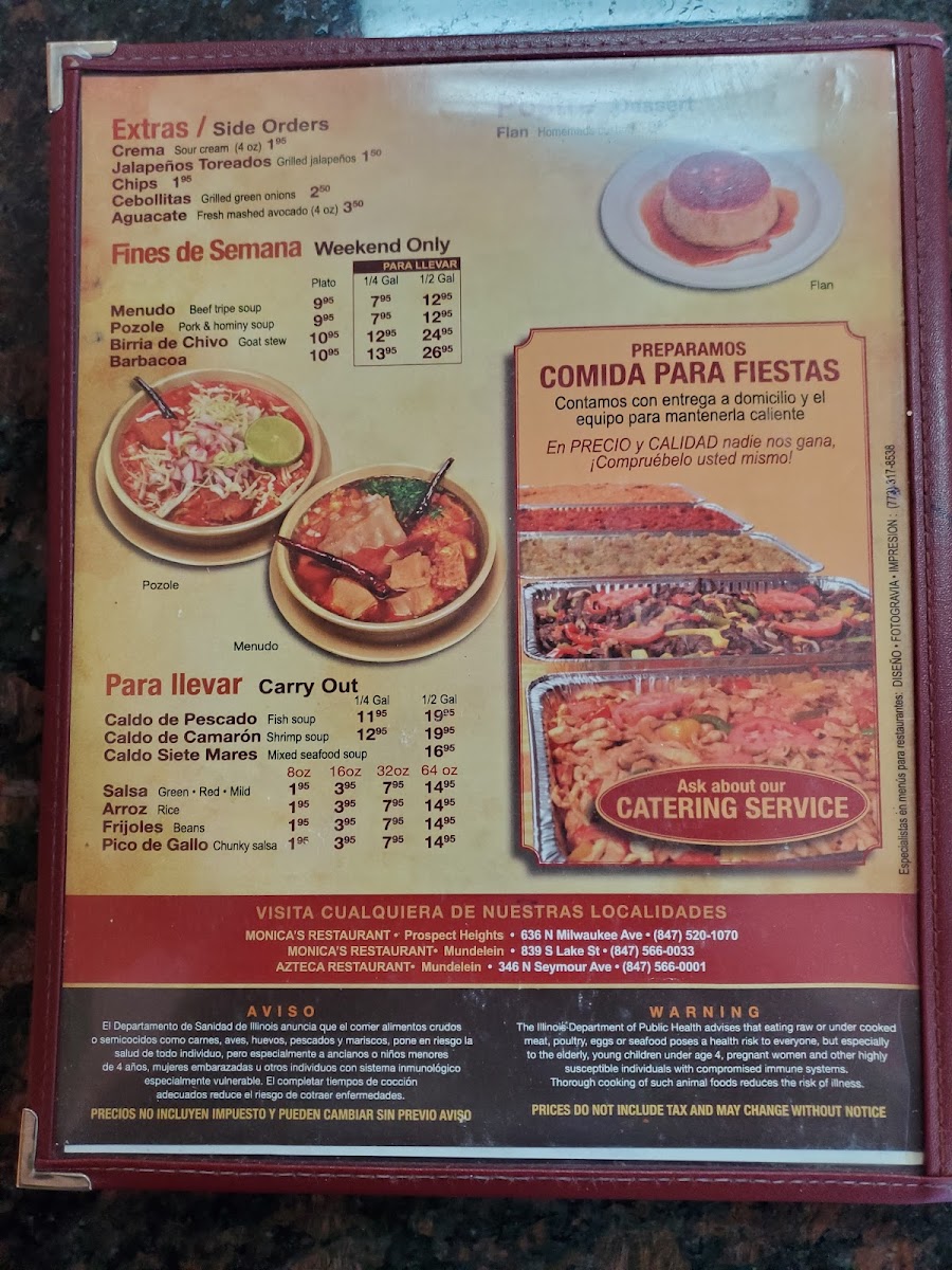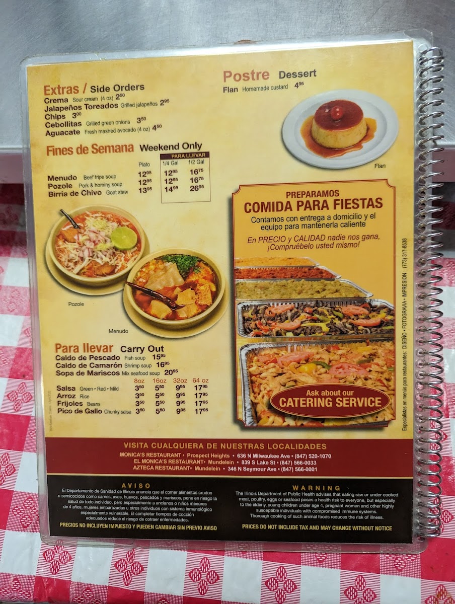 Welcome to Monica's Mexican Restaurant, nestled in Prospect Heights, where authentic flavors come alive. This charming eatery offers a diverse menu that delights both the palate and the pocketbook. The appetizers tempt with options like Chiles Toreados Jalapenos and Chips and Salsa, perfect for kickstarting your meal.